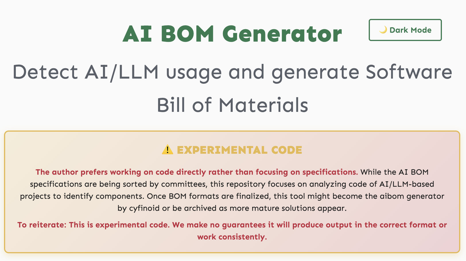 AIBOMMaker Experimental AI Bill of Materials generator. It scans GitHub repos for signs of LLM or AI usage in code, configs, CI and then lets you export an AI focused BOM in standard formats. π App: https://cyfinoid.github.io/aibommaker/ π Code: https://github.com/cyfinoid/aibommaker