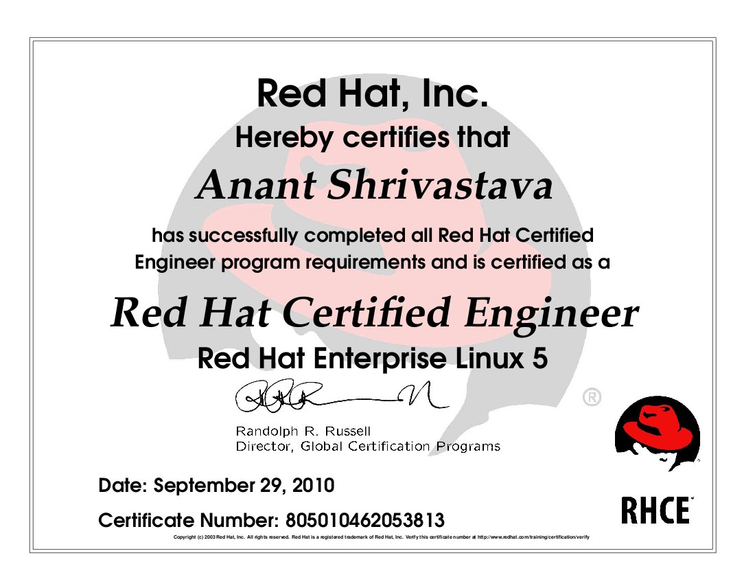 Facebook @anantshrivastava 01 October 2010, 21:45 Anant Shrivastava added a new photo. View original on Facebook → Finally after 6 Years of starting the pursuit. I am now Officially REDHAT CERTIFIED ENGINEER (RHCE)