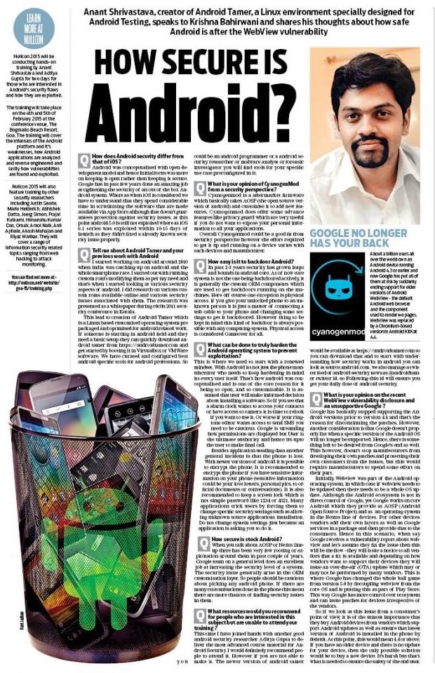 My Interview about Android and its security. We also talked about @[255919644518163:274:Android Tamer] and @[215837418396:274:NULLCON] and yes latest webview vulnerability in android and what it means for the enduser. Read it here : http://www.dnaindia.com/scitech/interview-how-secure-is-android-anant-shrivastava-2053748 or image is also attached.